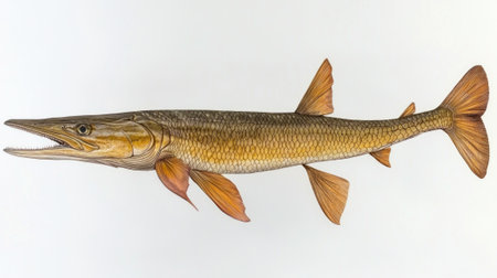 Gar member of the Lepisosteidae family is illustrated in stunning detail highlighting its elongated body sharp teeth and distinctive fins against a neutral backdrop.
