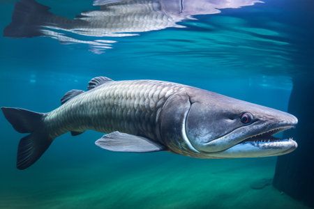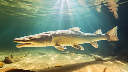 This spectacular Alligator gar (Atractosteus spatula) swims in the freshwater. Generative AI