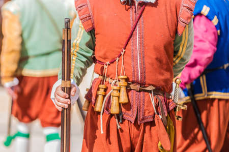 Man firing with old gun wearing traditional clothes from middle ages