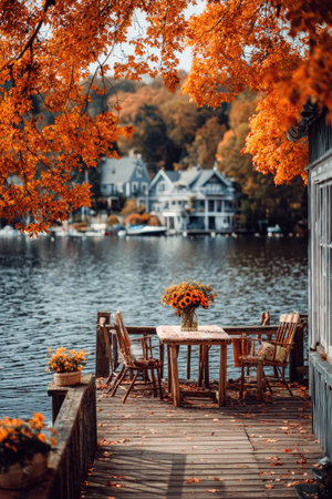A scenic view reveals a wooden deck with a table and chairs set, overlooking a calm lake. Autumn leaves in shades of orange and red frame the scene. The image displays natural lighting and a peaceful ambiance. It could be useful for illustrating seasonal themes or adding visual appeal to various editorial projects.