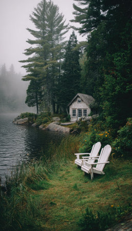 An inviting outdoor scene presents a small cabin and two chairs resting near a calm lake. Lush green grass and tall trees surround the building and the water. The image employs natural lighting, suggesting a serene day, appropriate for various editorial or commercial projects.