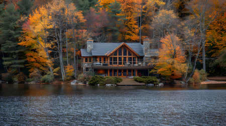Lakeside cabin surrounded by vibrant autumn foliage reflecting on calm waters at sunset