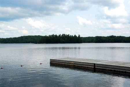 Beautiful lake with docks and diving platform in Ontario Canada cottage country