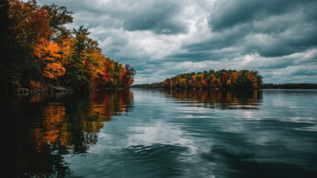 Experience a stunning autumn landscape showcasing colorful trees reflecting on a calm lake under a dramatic cloudy sky, evoking tranquility and beauty.