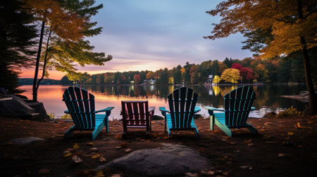 Tranquil Morning Scene At A Lakeside Cottage With Vacant Adirondack Chairs On The Dock, Ample Space For Text. Concept Sunset By The Beach, Urban Cityscape At Night, Fall Foliage In The Forest.