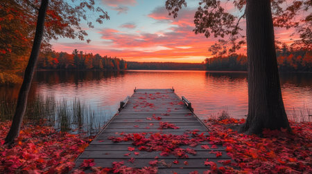 This stunning image captures a serene autumn sunset over a tranquil lake, featuring a wooden dock surrounded by vibrant fall foliage. The colorful sky reflects in the calm waters, creating a picturesque landscape that evokes peace and relaxation.