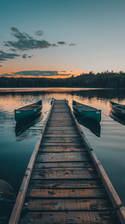 An autumnal twilight descends on a serene lake with canoes resting beside a weathered pier, reflecting the stillness of the season