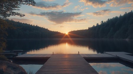 Tranquil sunset over a calm lake with a wooden dock, surrounded by dense trees under a soft sky.