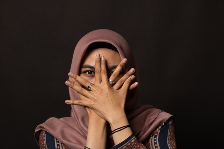Portraiture of Muslim Girl wearing hijab.Serious face reaction.