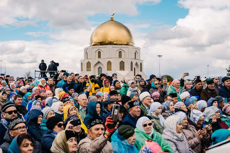 Bolgar, Tatarstan, Russia. May 21, 2022. The audience at the holiday concert. A woman shooting concert on smartphone