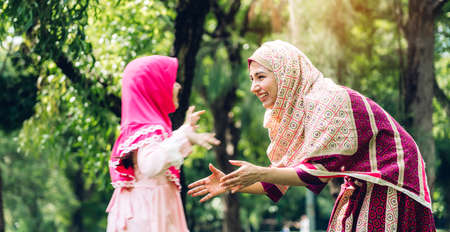 Portrait of happy happy lovely family arabic muslim mother and little muslim girls child with hijab dress in summer park,little girl run to mom and hug.Family and togetherness