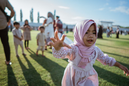 A young girl wearing a pink dress and hijab is happily enjoying a lively outdoor event