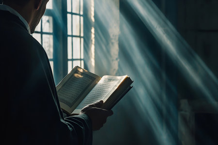 Sunbeams across a young Muslim males face while he reads the Quran