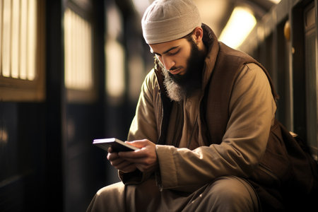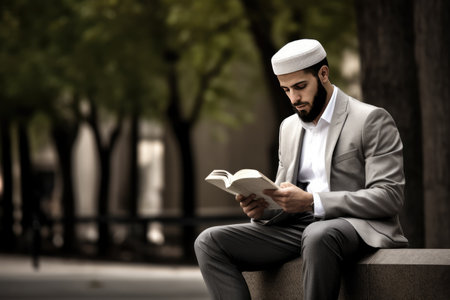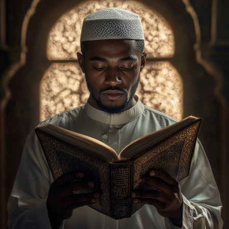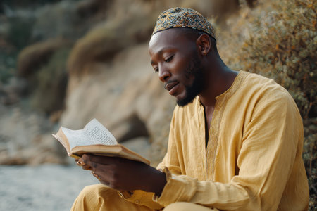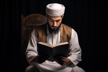A man is sitting in a library, engrossed in reading a book, A scholar teaching Quranic studies, AI Generated
