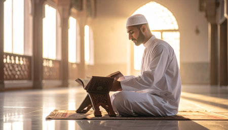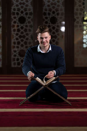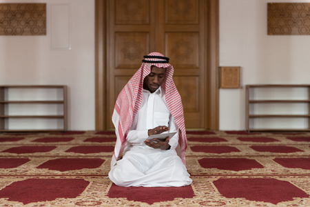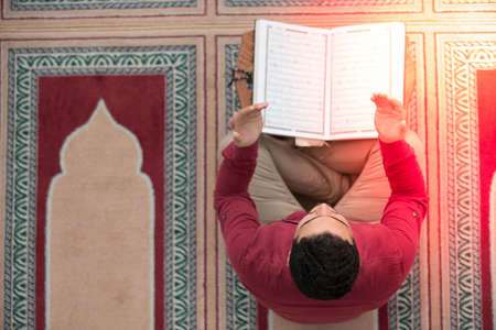 Young Muslim Man Reading The Koran at the Mosque, Ramadan Kareem