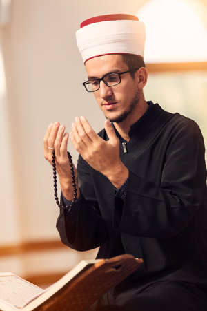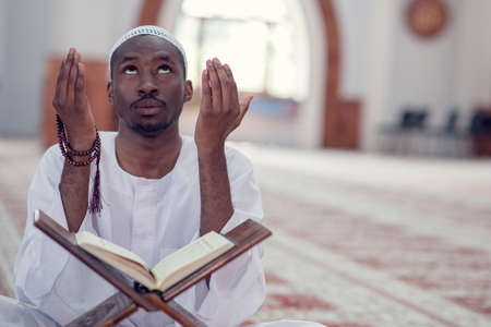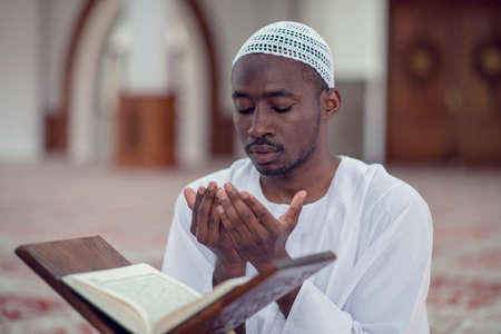 Ethnic man reading Koran and praying in mosque