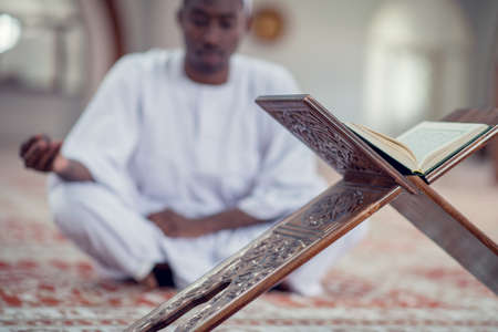 Black African Muslim Man Is Praying In The Mosque with open holy book of Koran