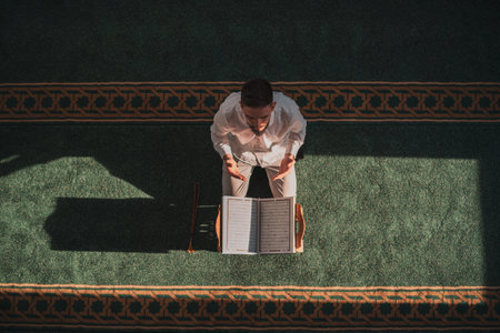 Overhead view of a Muslim man reading the Quran