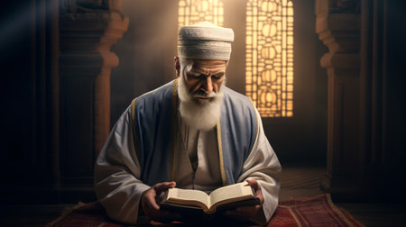 An old man reading the holy Quran in the mosque. Ramadan Kareem concept.