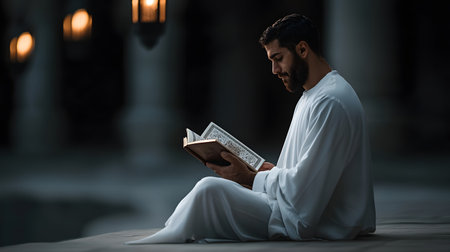 A man dressed in white sits quietly, reading the Quran with deep concentration, illuminated by lanterns. The ambiance is peaceful, enhancing a moment of reflection and devotion.