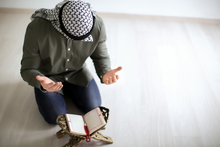 Young muslim man praying at home