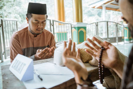 asian man paying zakat at the mosque and praying thanking god