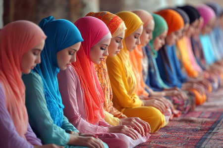 Women in vibrant hijabs praying in a serene mosque setting