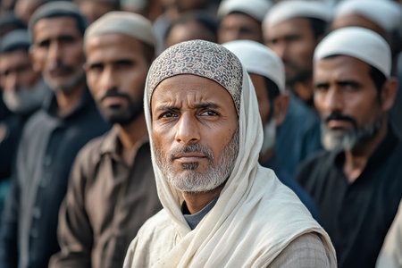 A diverse group of Indian Muslim men gathered in a village, showing their distinct features and cultural attire while sharing stories and camaraderie.