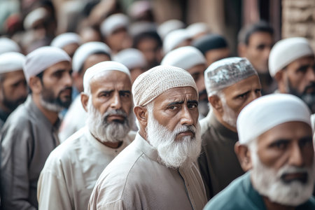 In a serene outdoor setting, a close-up captures a group of Muslim men with long beards and white skullcaps, reflecting shared moments of contemplation and community.