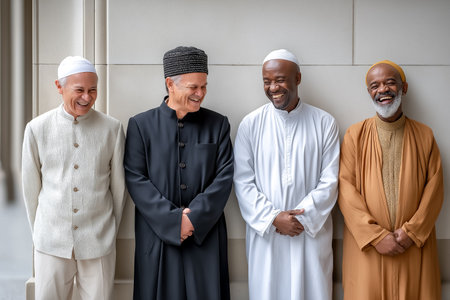 Group of religious leaders from different faiths share a light moment outdoors wearing traditional attire. Neutral background and open space enhance sense of community.