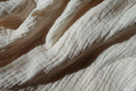 Close up of crumpled white fabric, soft focus. Abstract background.