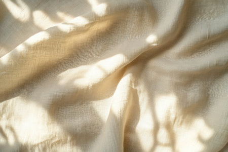 Natural light casts soft shadows across delicate linen fabric, creating a minimalist, neutral texture background with copy space.