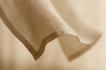 Beige curtain gently flowing in the wind, creating elegant folds and a sense of lightness and movement
