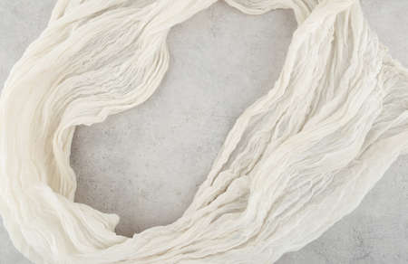 Wrinkled gauze fabric on light grunge stone background. Cotton gauze fabric cloth on stone tile surface with copy space.