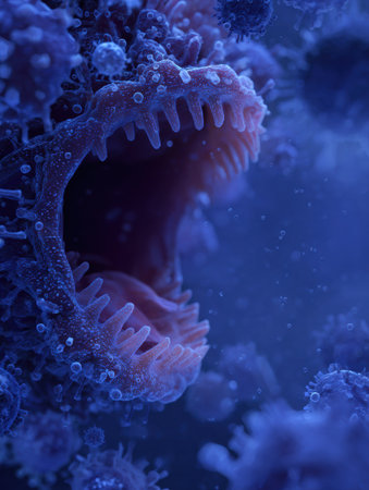 Microscopic view captures cold germs entering the mouth, emphasizing unique shapes and textures, with an empty space to the right creating focus and intrigue.