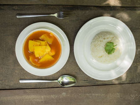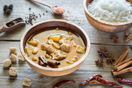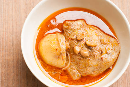 Thai food, pork massaman curry with potatoes, peanuts, coconut milk and onions in a cup on a wooden table