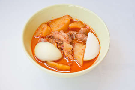 Fresh prepared spicy red massaman curry with chicken and potatoes on local market in Bangkok. Traditional thai cuisine made of fresh ingredients.
