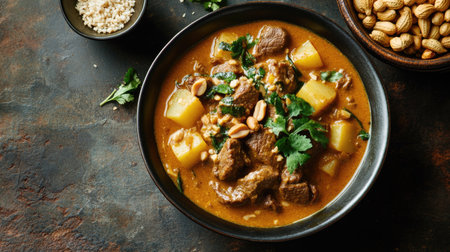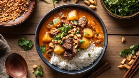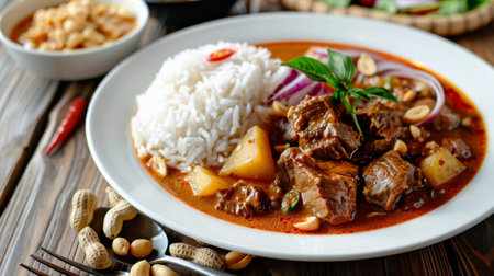 Delicious massaman curry with beef, potatoes, rice, and peanuts is served in bowl top view, Thai cuisine
