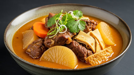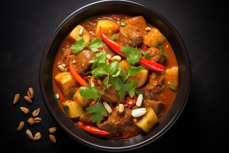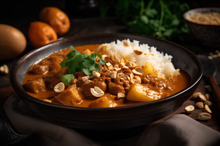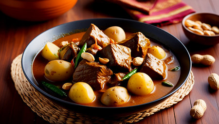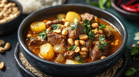 a comforting Massaman curry with tender chunks of beef, potatoes, and roasted peanuts in a flavorful. Ai generative