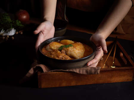 Close up view of female hand holding wooden tray with a bowl of chicken Massaman Curry, Thai food