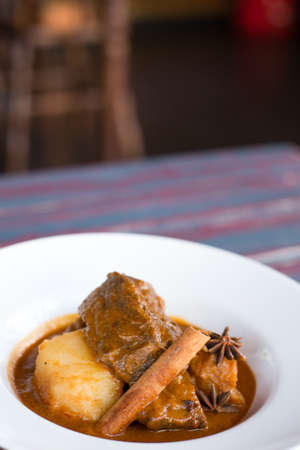 Beef stew with chickpeas and potatoes in a bowl. Traditional Thai Dish, Massaman Curry