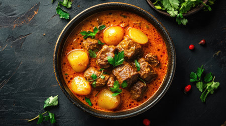 Top view of a serving of Massaman curry with tender beef and potatoes. -