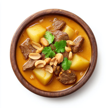 A delicious serving of Thai Massaman curry with beef, potatoes, and roasted peanuts.