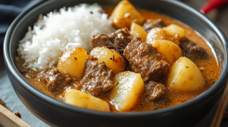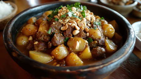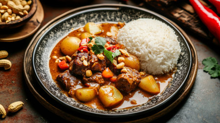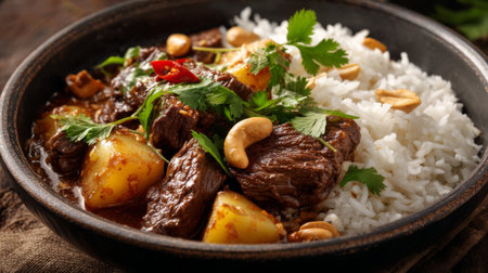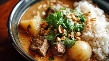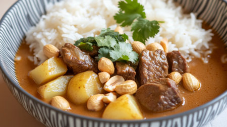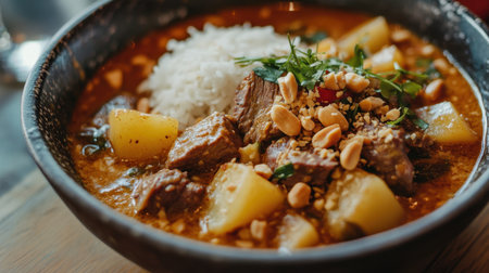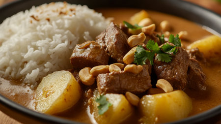 A traditional Thai Massaman curry with tender beef, potatoes, and peanuts, served in a rustic bowl with steamed rice.