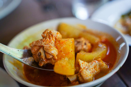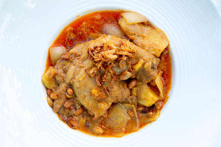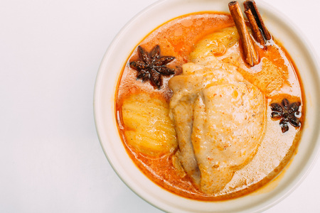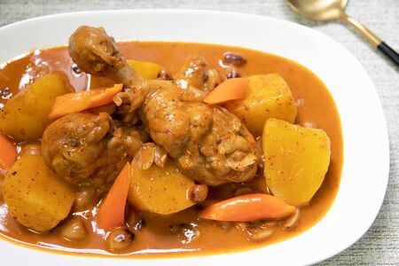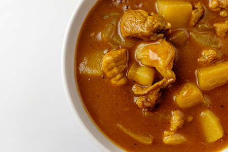 Close up Muslim style chicken and potato curry or chicken mussaman curry - deep focus image with path