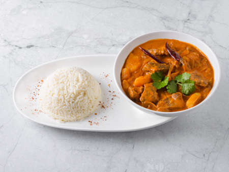 Thai Beef Massaman Curry with Rice, dark background copy space