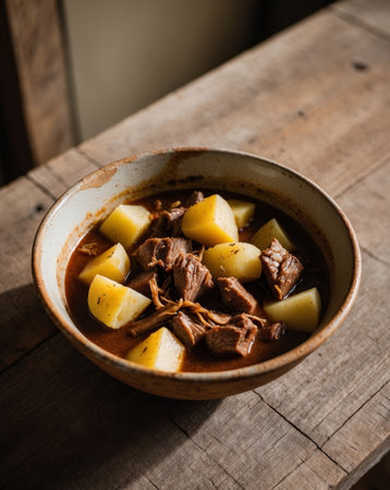 A mouthwatering beef stew with tender potatoes served in a rustic bowl. This hearty dish showcases rich flavors and fresh herbs, perfect for comfort meals.