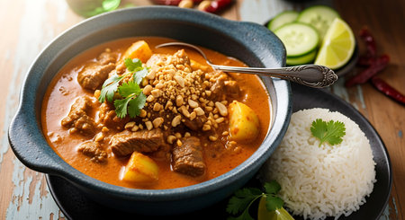 A rich and creamy Thai massaman curry with beef, potatoes, and peanuts, served in a traditional bowl with rice on the side.