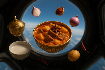 AI generated surreal Thai massaman curry floating in zero gravity with ingredients and Earth view dreamy cinematic atmosphere