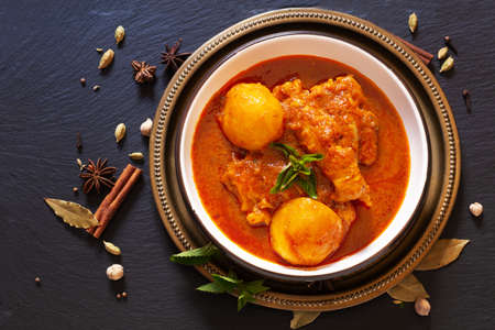 Asian food concept homemade spicy Chicken masala or Thai Massaman curry with spices foreground on black slate stone with copy space